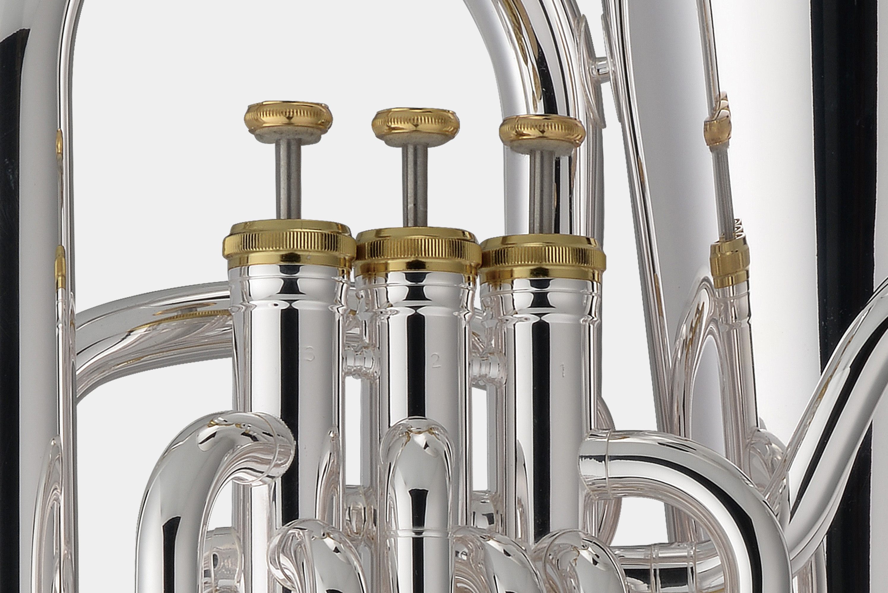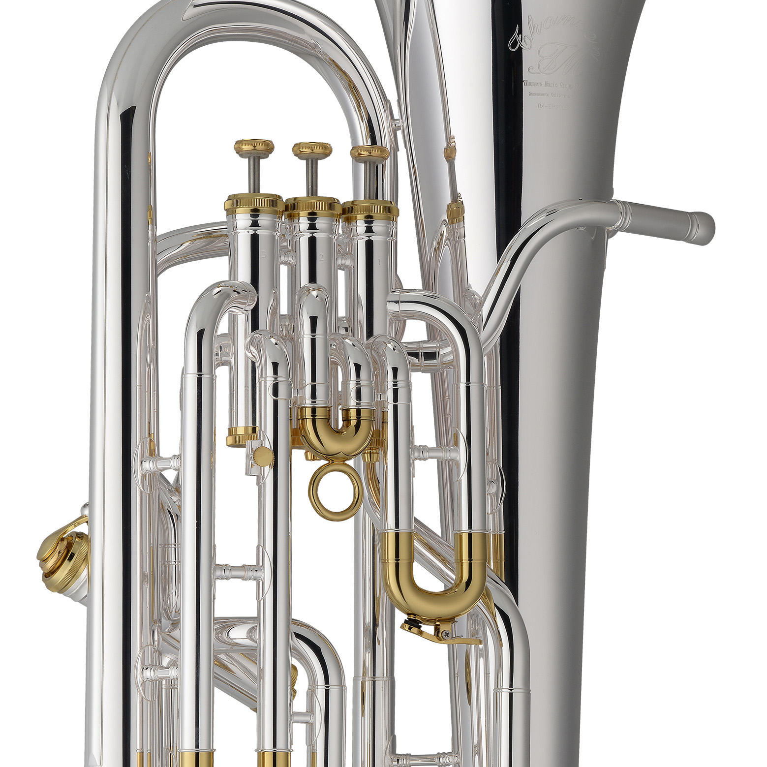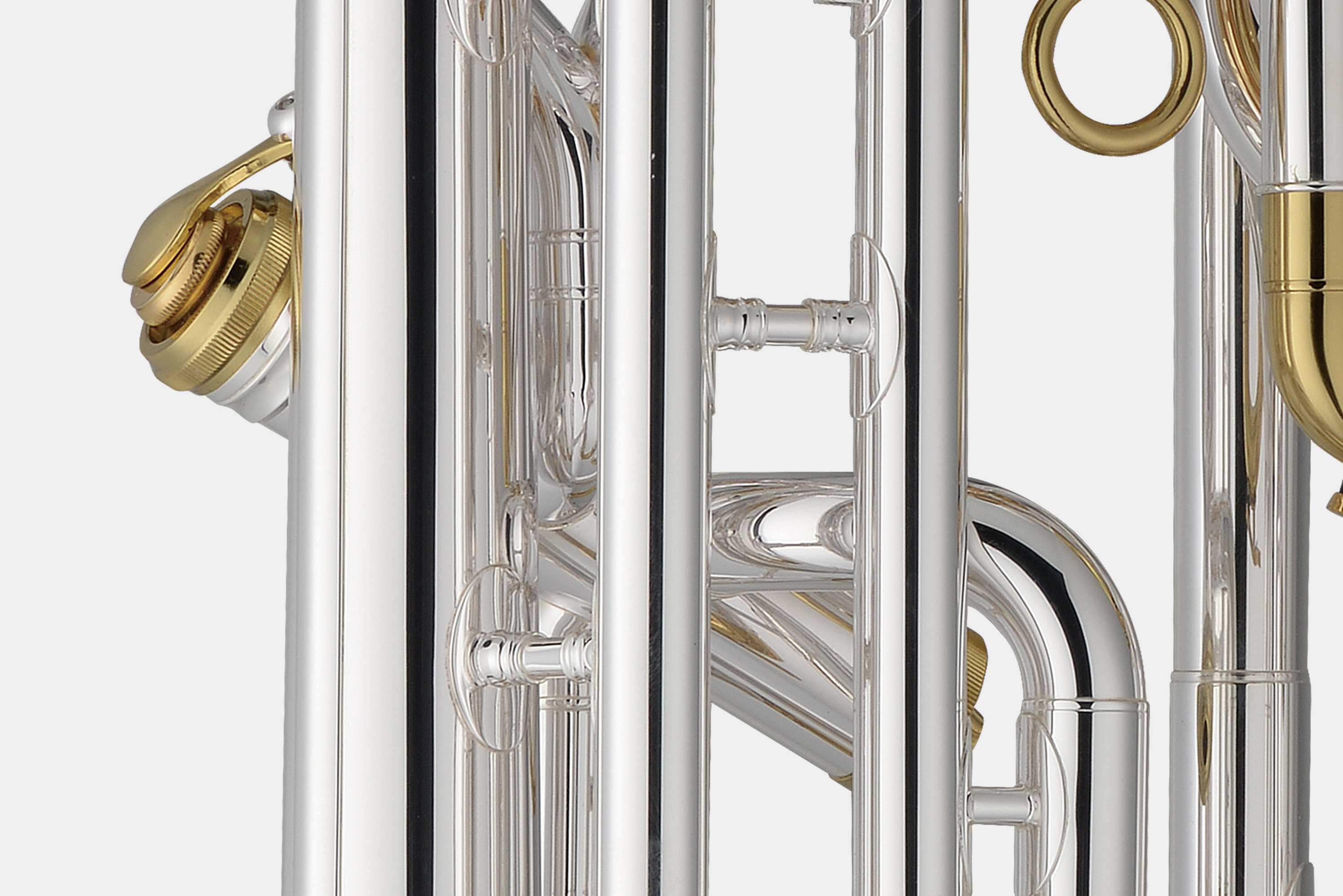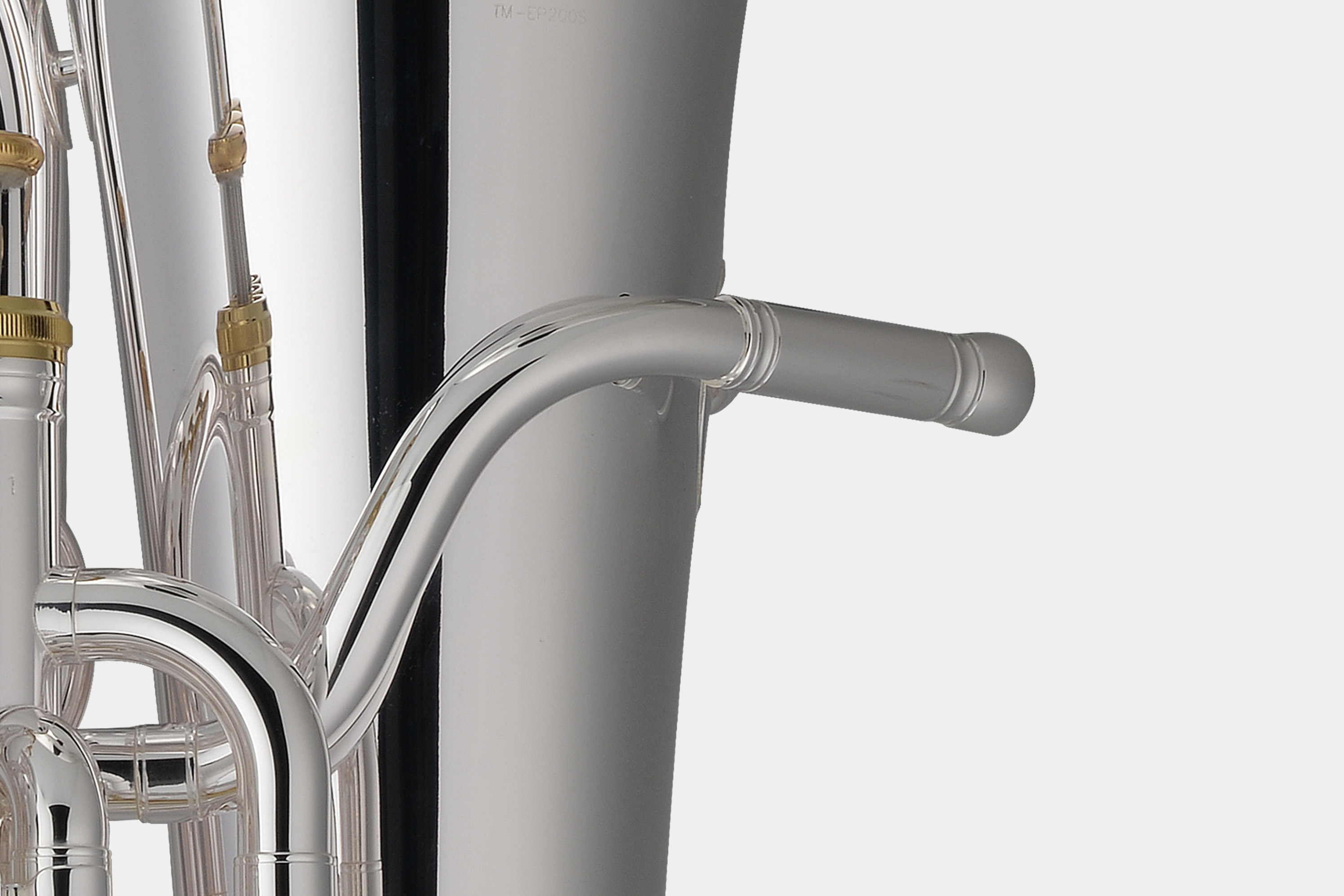 托马森EP200S三活塞上低音号,黄铜吹口管,16.8MM管径,管身镀银增加了乐器的音色亮度,调音管镀金增加演奏阻力。