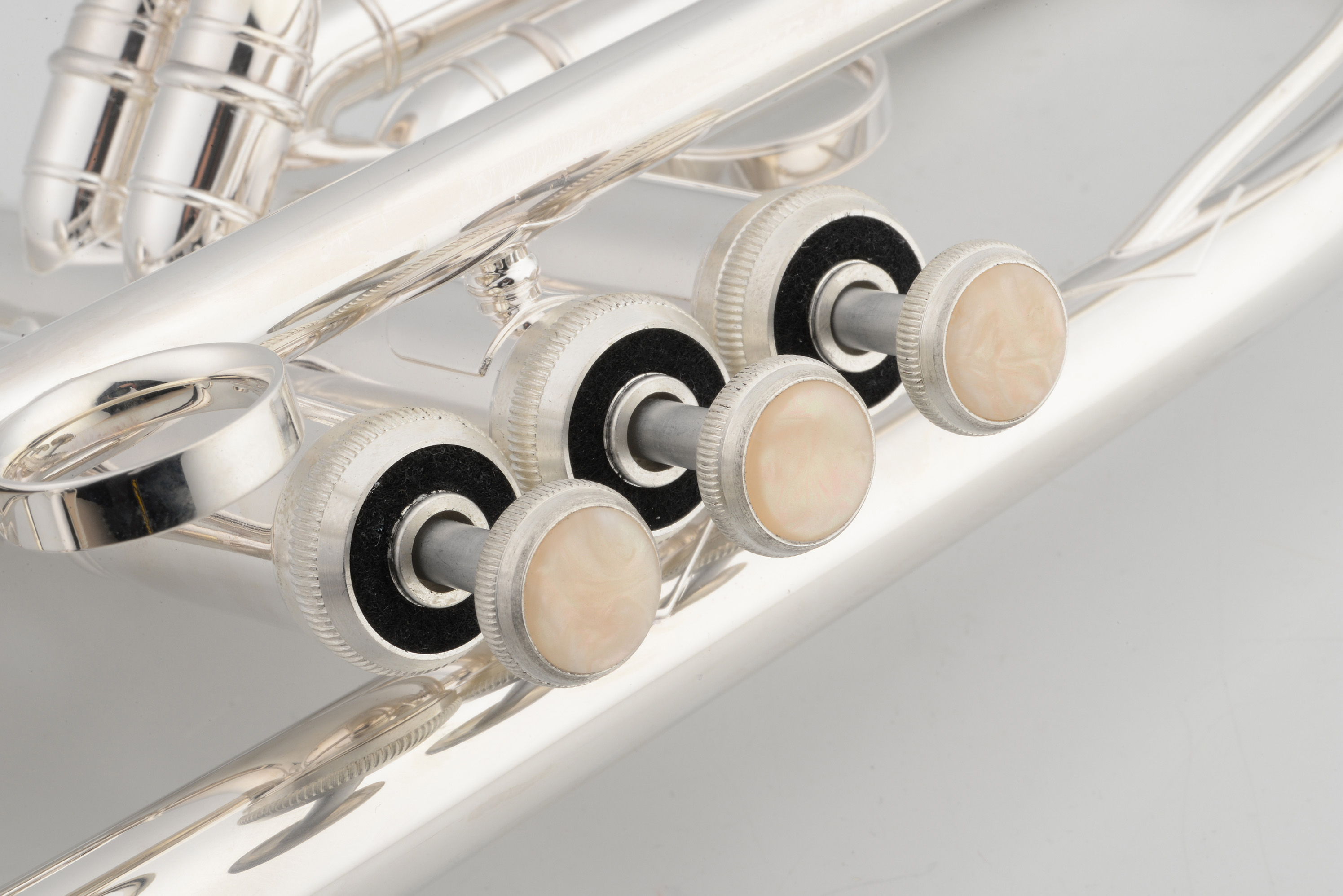 金铜材质表面镀银双放水阀天然珍珠贝活塞盖耐磨不锈钢活塞7C号嘴内管11.66MM喇叭123MM一体喇叭手工敲制PU箱